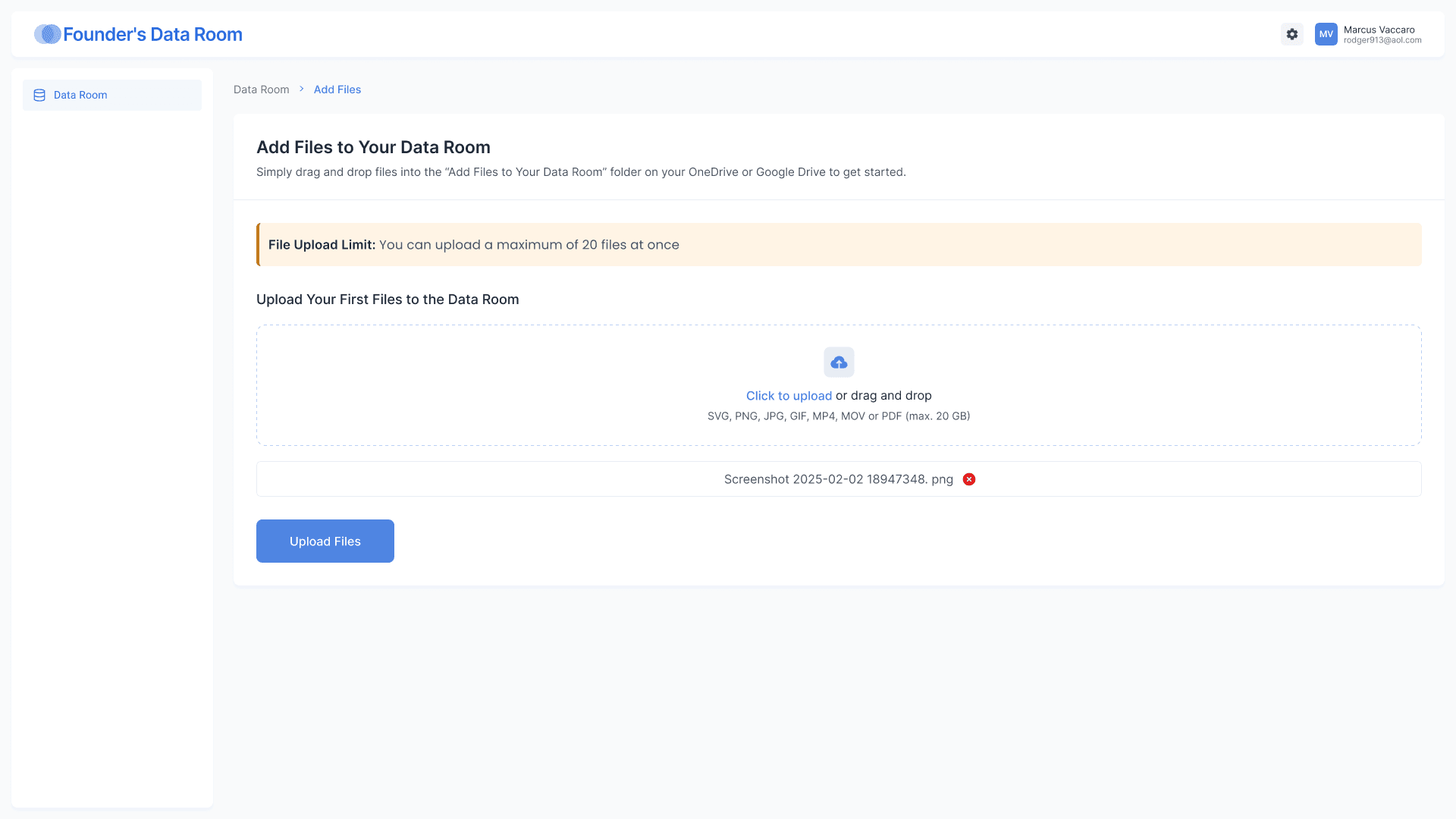 Founder's Data Room is a secure, multi-tenant platform for managing and sharing sensitive documents. It features role-based access (Admin/Super Admin), cross-tenant permissions, email invitations, centralized document control, and Google Drive integration.