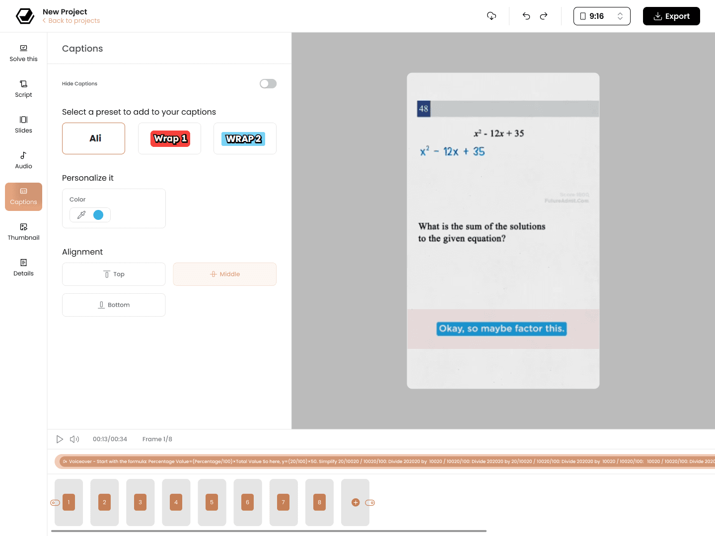Timewise is an AI-powered platform that enables educators to create short-form SAT Math videos effortlessly. It streamlines the entire video creation process—from scripting to exporting—within a single interface. Teachers can use built-in AI tools, customizable slide design, and curated math questions to produce engaging content. All videos are optimized for platforms like TikTok, Instagram Reels, and YouTube Shorts.
